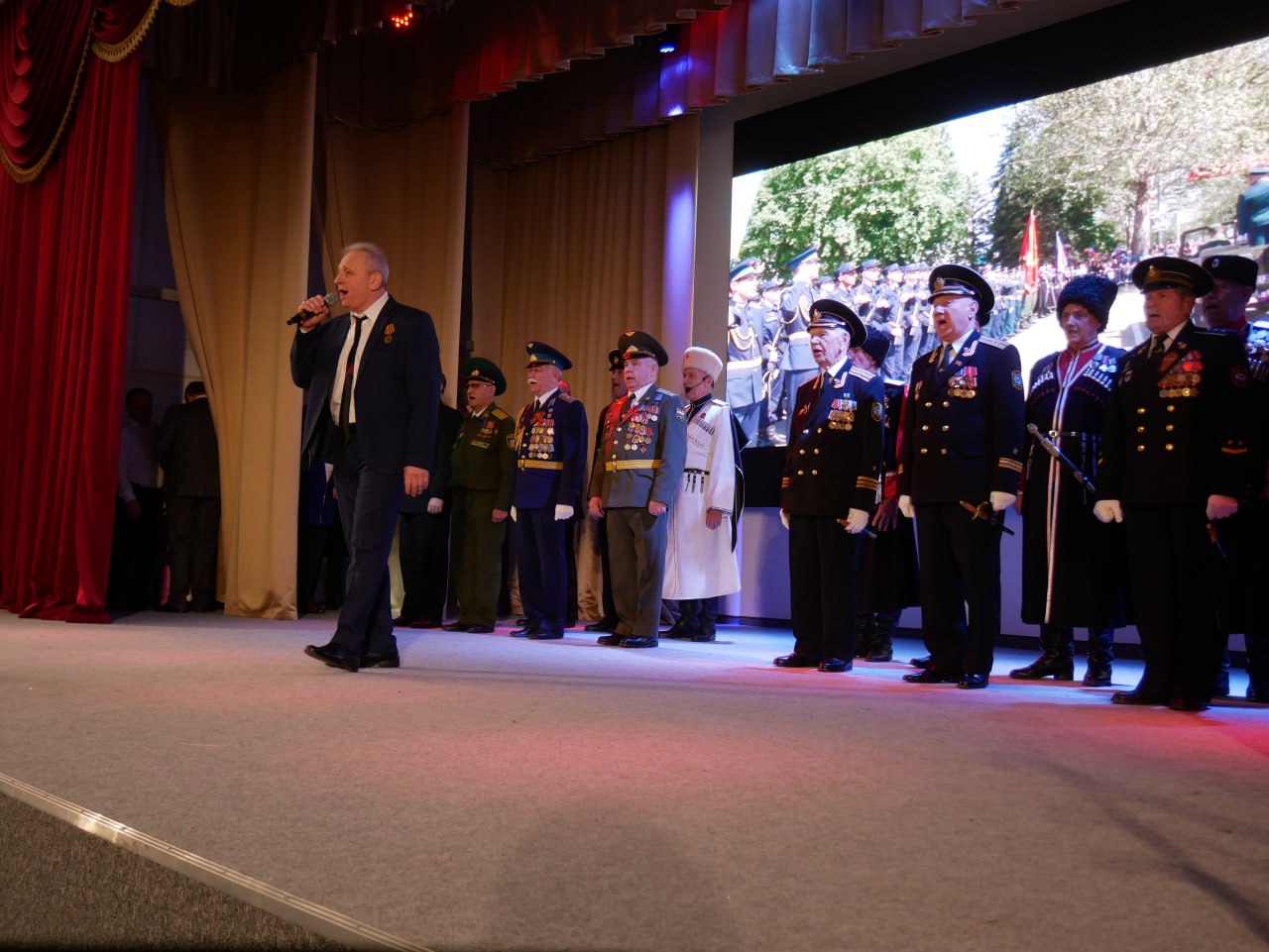 «Марш Победы» исполнил солист Александр Попондуполо вместе с хором силовиков. В зале также присутствовали представители известного в мире Российского Мотоклуба «Ночные Волки», которым торжественно вручили карту боевого пути от Кубани до Кенигсберга 11-го Гвардейского стрелкового корпуса и портрет его командующего – генерала Хижняка Ивана Лукича.