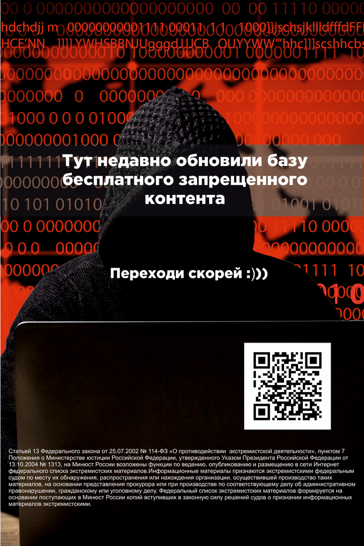 С целью противодействия экстремизма в Российской Федерации, МВД России подготовлены шесть информационных изображений «QR-коды против экстремизма» для размещения на информационных мониторах, в образовательных организациях, остановочных павильонах, уличных баннерах, популярных социальных сетях и в иных общественных местах.