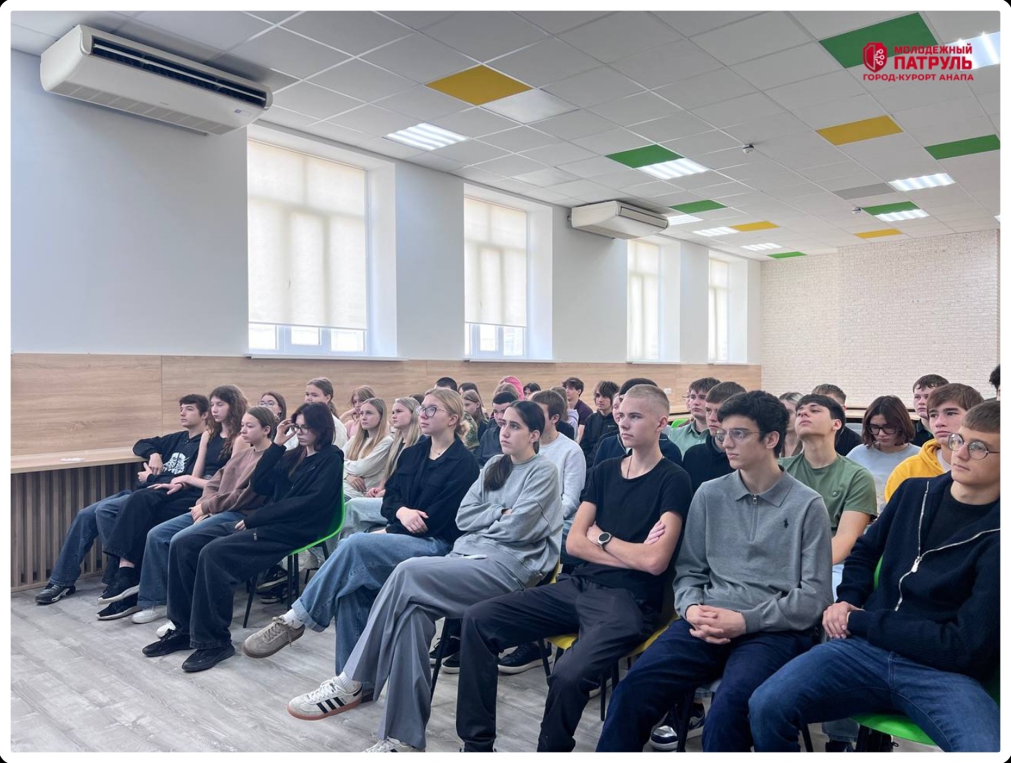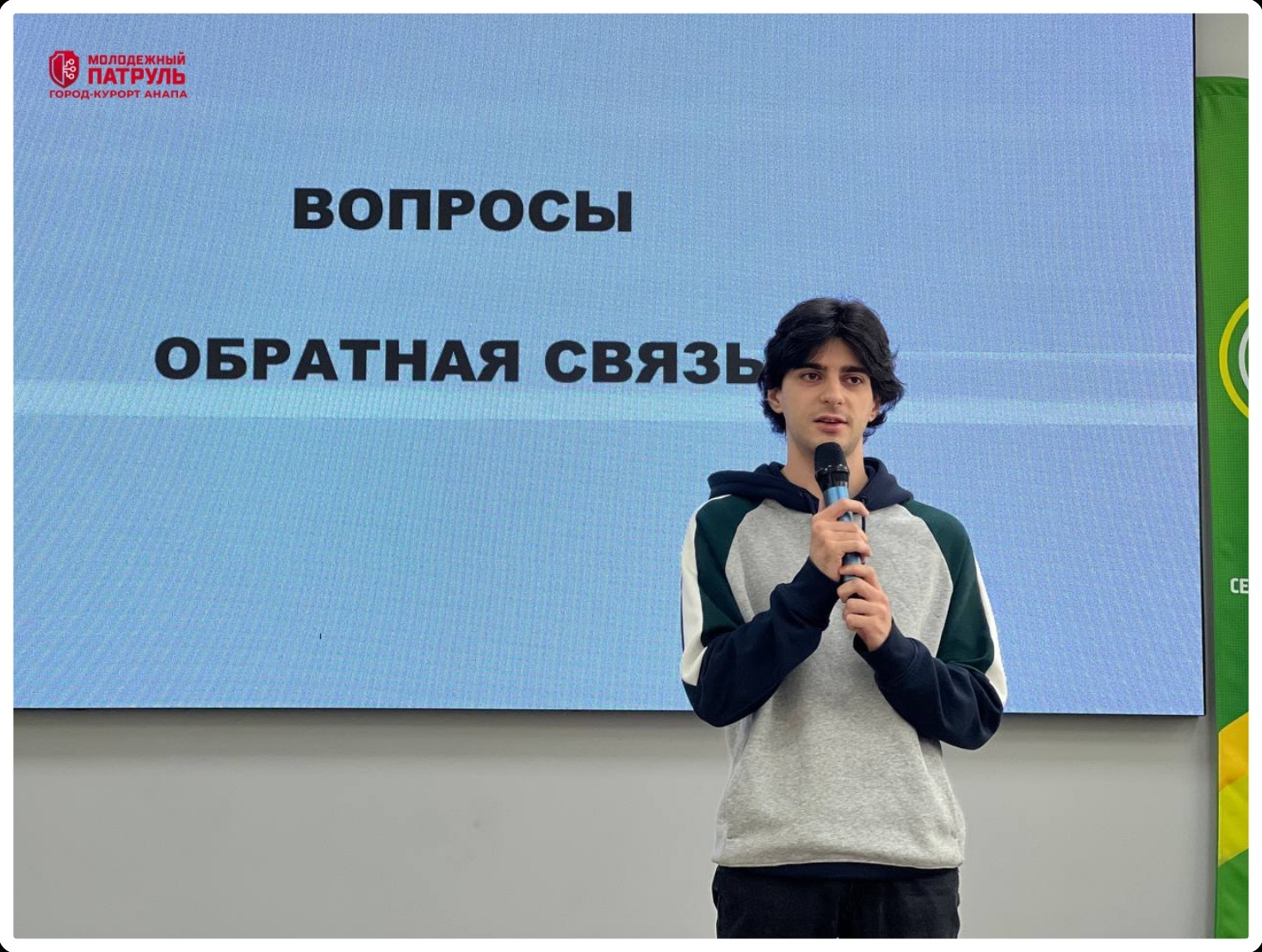 Председатель общественного объединения правоохранительной направленности «Молодежный патруль» города Анапы проинформировал о деятельности антинаркотического движения и пригласил принять участие в творческих и интеллектуальных мероприятиях, проводимых управлением молодежной политики администрации города Анапы, а также рассказал о различных формах занятости в свободное от учебы время, о том, как вступить в ряды добровольцев (волонтеров) и получить первые волонтерские часы, что способствует профилактике вредных зависимостей у подростков.