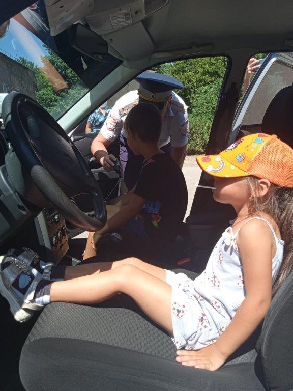 Юные участники дорожного движения примеряли на себя бронежилет и каску, знакомились с принципом работы радиостанции, сигнального громкоговорящего устройства, фотографировались в патрульном автомобиле.