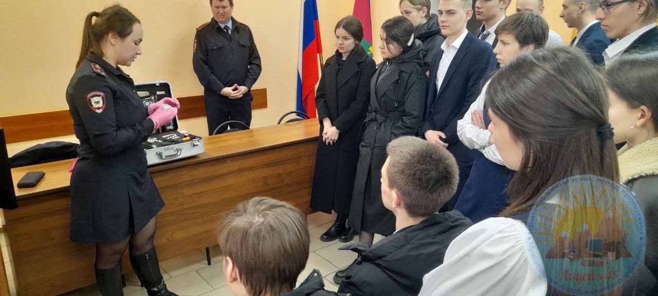 27 февраля 2024 г. учащиеся 11 «А» класса МБОУ лицей № 45 им. академика Королева г. Кропоткина посетили отдел полиции МВД России по Кавказскому району, где в рамках профориентационной беседы ребят ознакомили со службой в органах внутренних дел, рассказали об условиях поступления в ведомственные высшие образовательные организации и отборе кандидатов на службу в органы внутренних дел. Старшеклассники узнали о работе различных подразделений отдела полиции: об особенностях службы кинологов, об обучении служебных собак, о работе криминалистов.