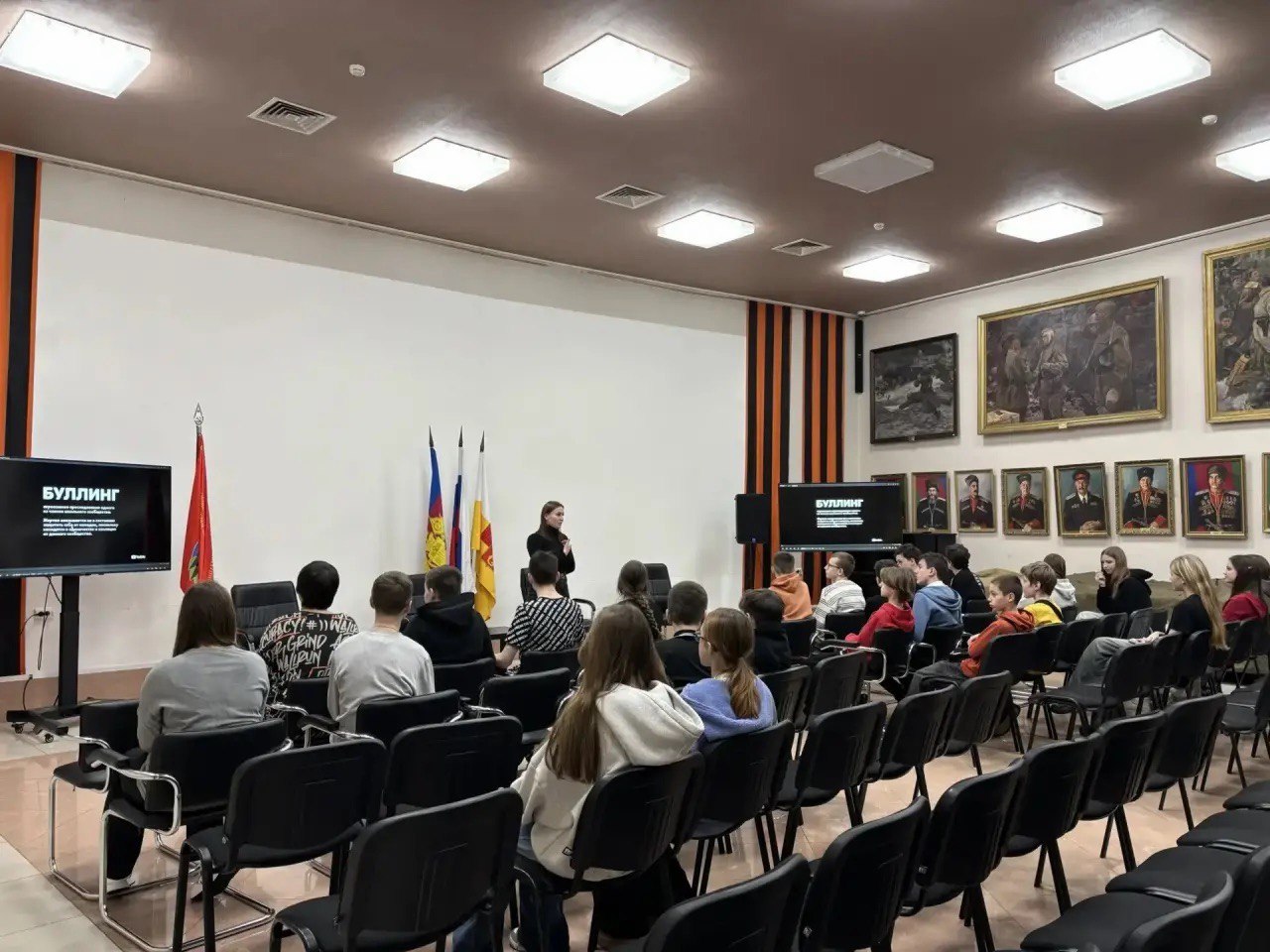 Для участников проведена экскурсия по Выставочному залу боевой славы и организован показ фильмов «Интервью с собой» и «Шум», ориентированных на привлечение внимания к проблеме буллинга (травли) и аутоагрессивного поведения среди подростков.