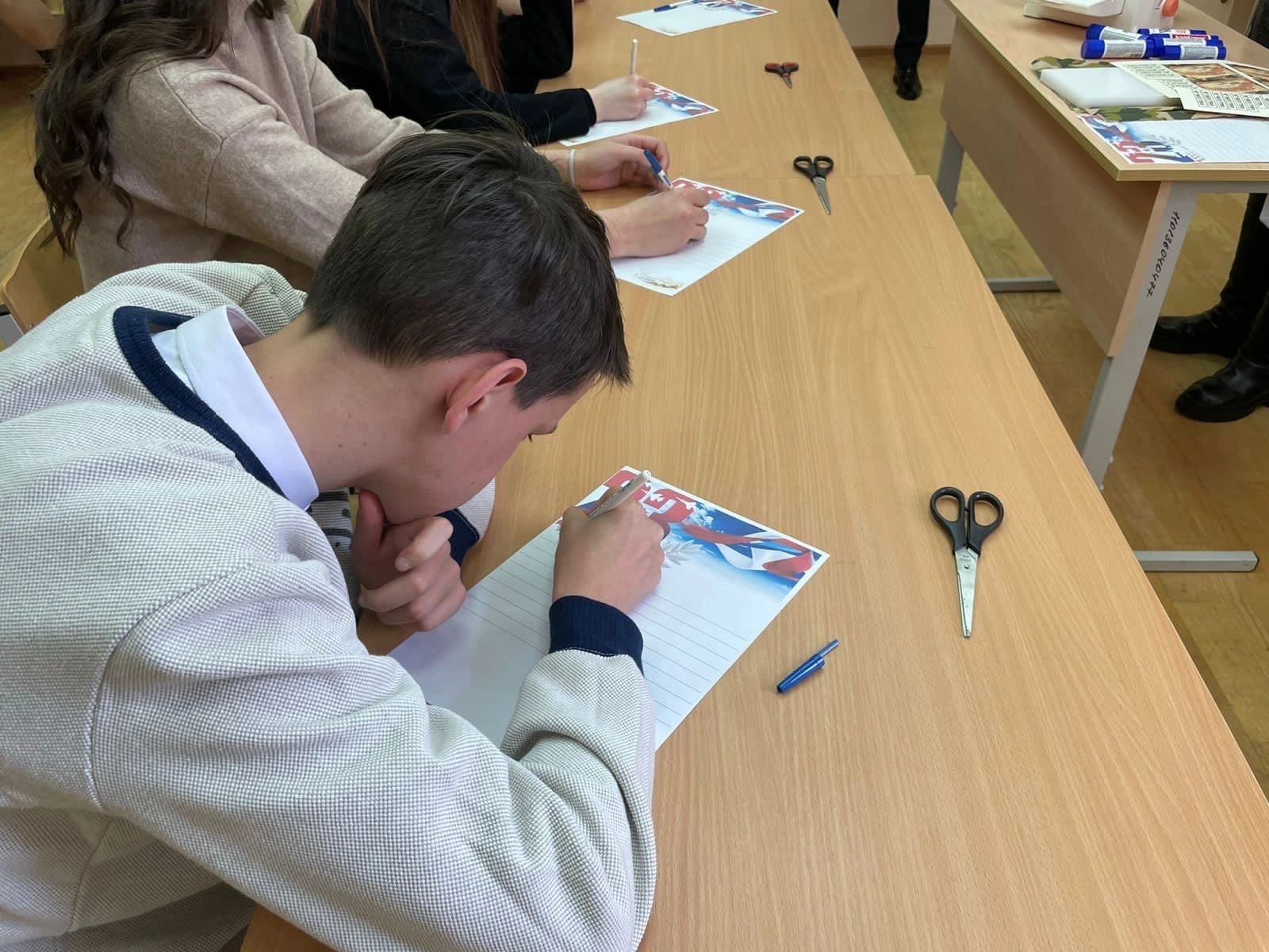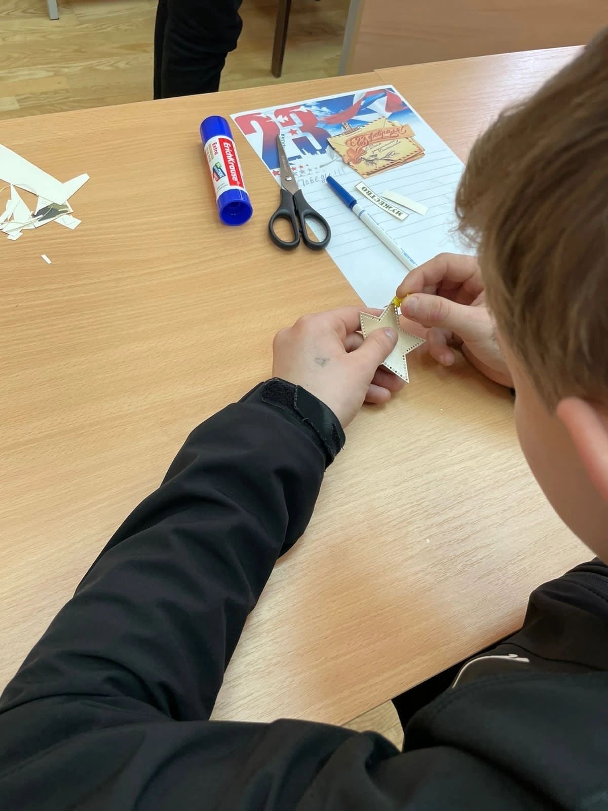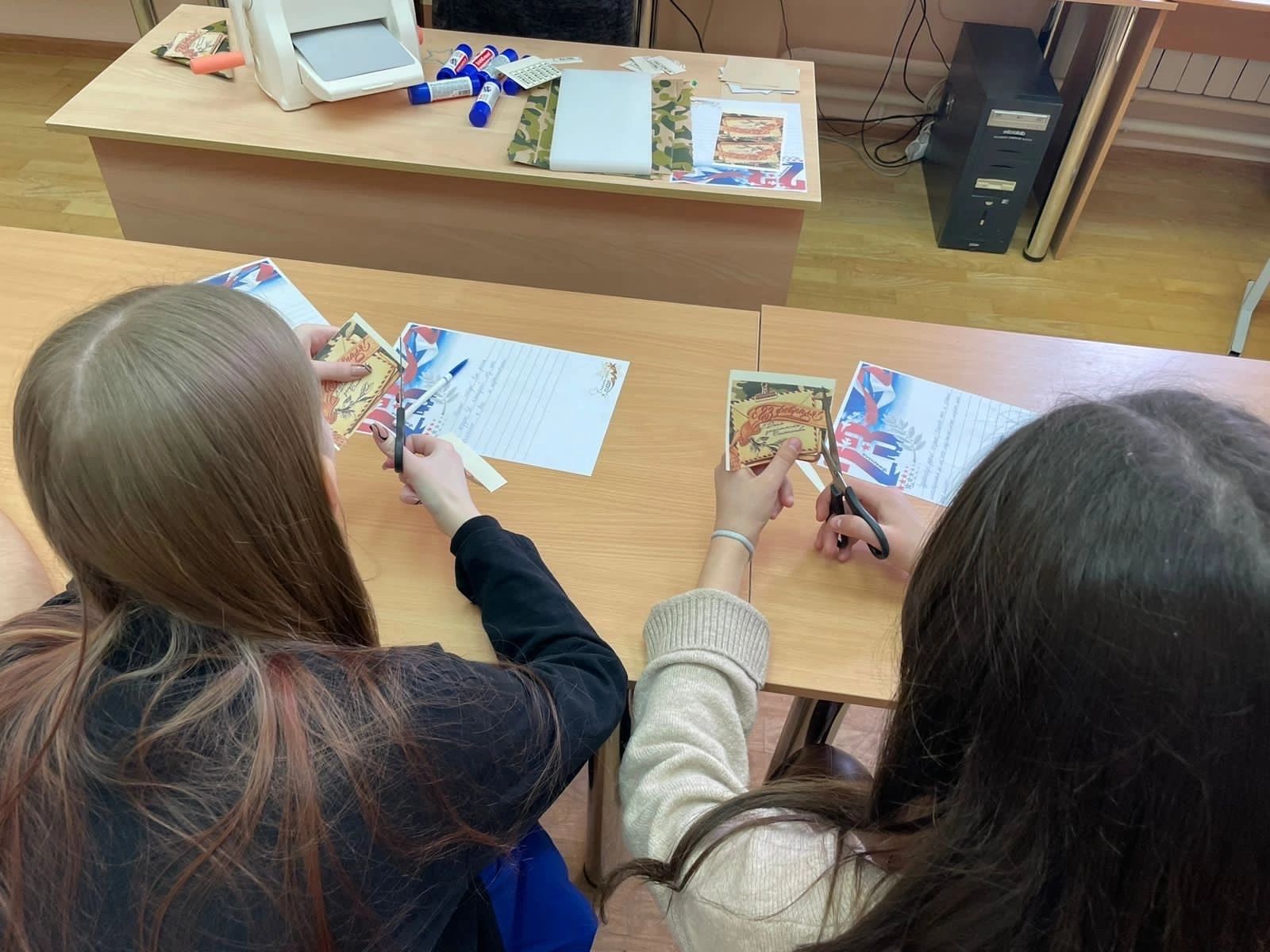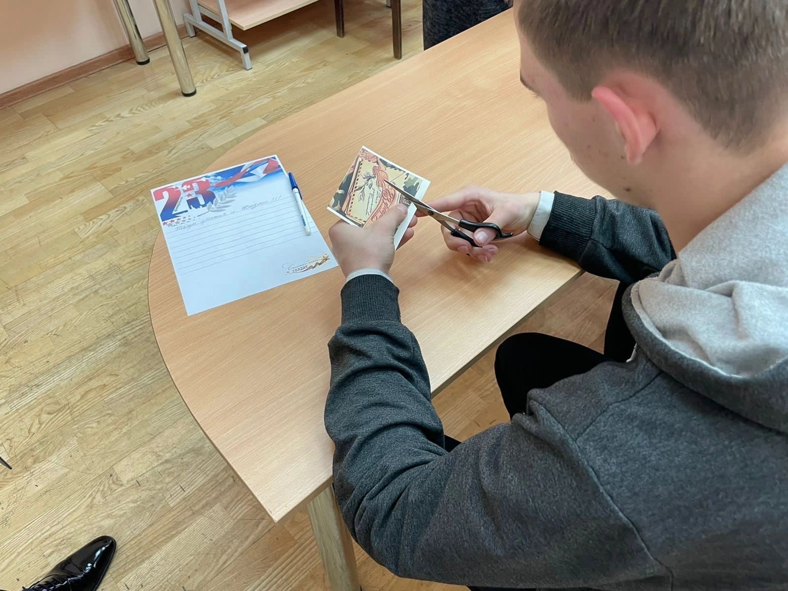 С помощью специалиста дома детского творчества Лебедевой Полины Николаевны на машинке для вырубки и тиснения ребята изготовили конверты «Письмо солдату. С Днем Защитника Отечества», в которые вложили свои письма, написанные военнослужащим Российской Армии, защищающим честь нашей Родины в зоне СВО.