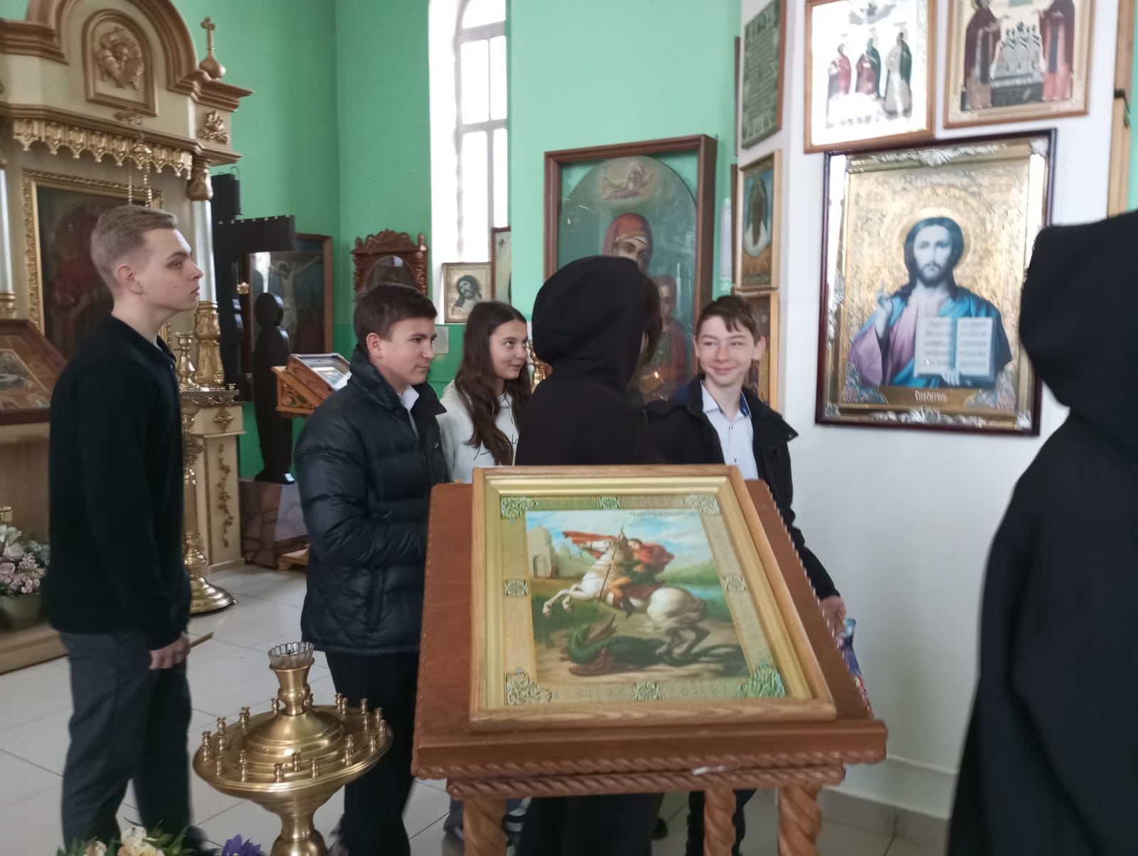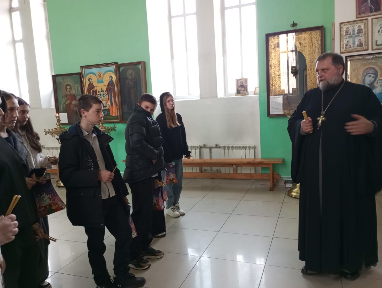 Настоятель храма провел с несовершеннолетними беседу, экскурсию по храму, рассказал о святых, изображенных на иконах.