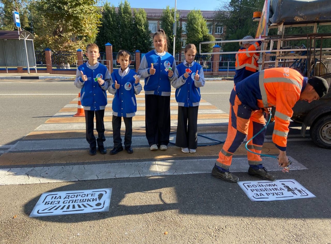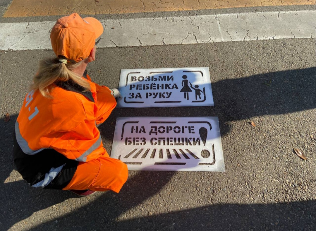 Надписи «На дороге без спешки!» и «Возьми ребенка за руку» были нанесены с 2 сторон пешеходных переходов вблизи образовательных организаций.