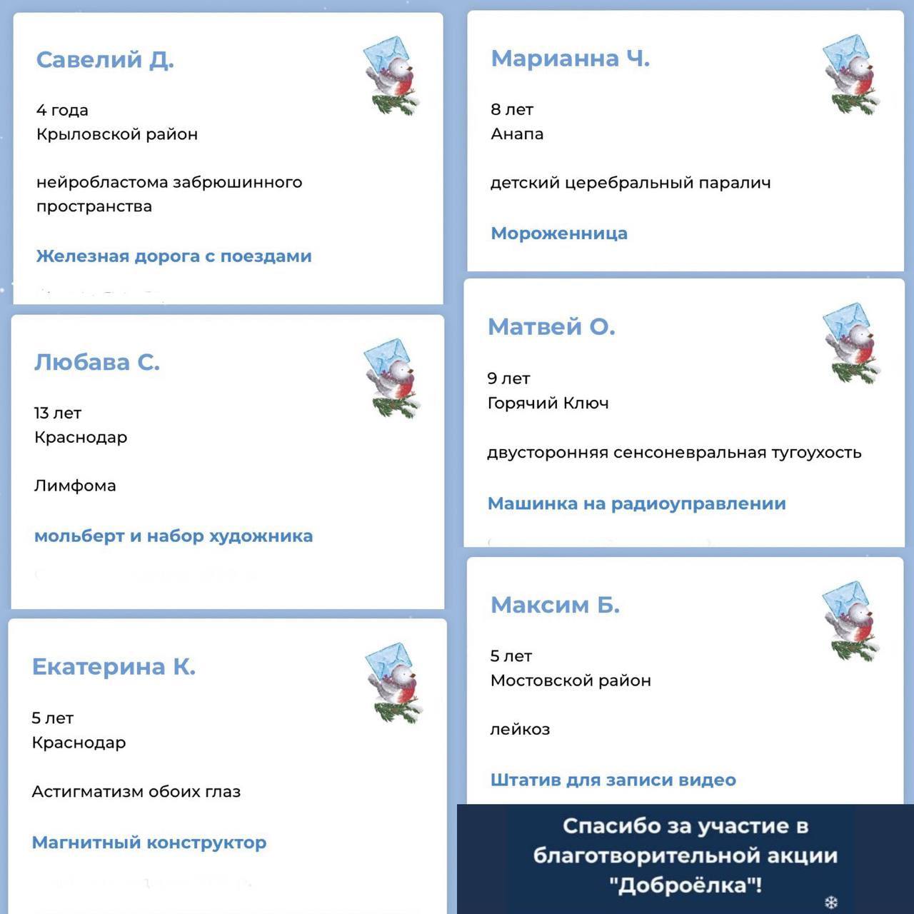 Душевная традиция в канун Нового года проводится на Кубани — участвовать в акции от благотворительного фонда «Край Добра». На сайте доброелка.рф можно выбрать открытки с желаниями детей. В новогодних открытках ребята, которые отважно сражаются с тяжелыми болезнями, пишут свои детские желания, о чем они мечтают, какие подарки хотят получить к Новому году. Это обычные игрушки, конструкторы, книги, гаджеты. Удобно, что сделать это можно в онлайн-формате. А подарки детям доставят уже сами волонтеры.