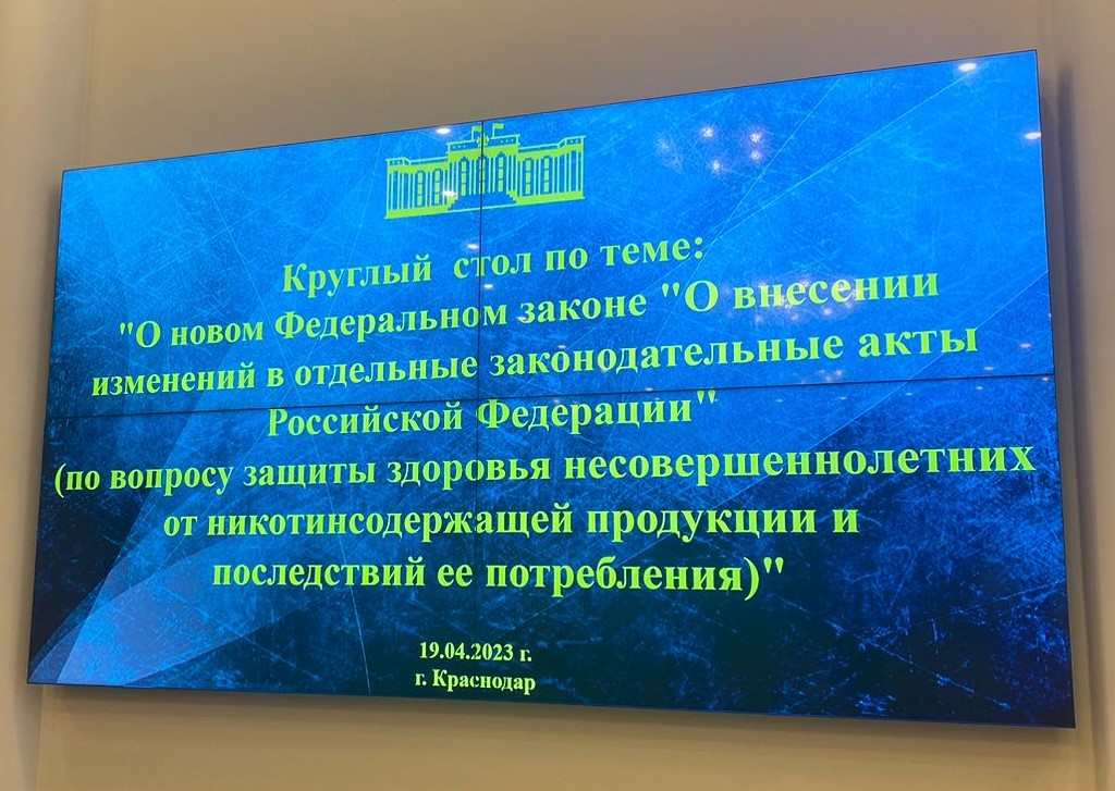 19 апреля 2023 г. в Законодательном Собрании Краснодарского края состоялось заседание «круглого стола» по вопросу защиты здоровья несовершеннолетних от никотинсодержащей продукции и последствий ее потребления.