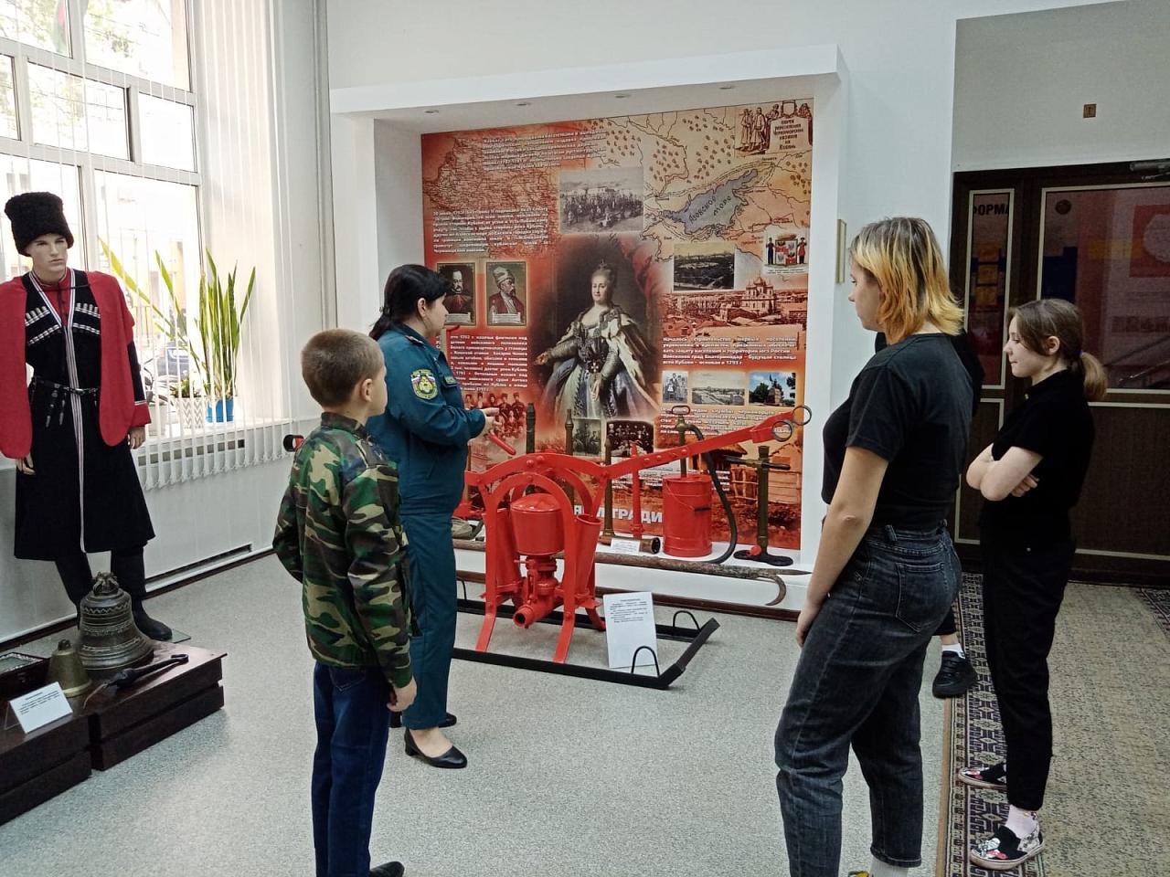 Возле стенда, посвященного неаккуратному обращению с электроприборами, экскурсовод музея провела с детьми беседу по технике пожарной безопасности.